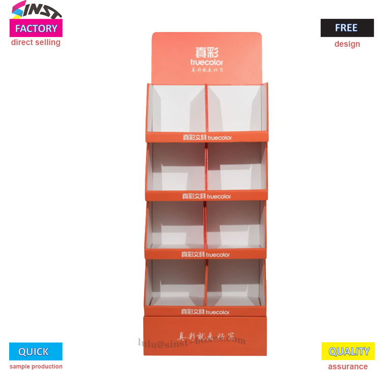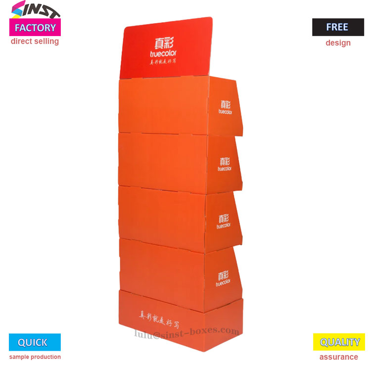 Is díol spéise amhairc agus déantán éifeacht branda é an seastán taispeántais páipéar rocach dearg oráiste seo. Tá gach ciseal den chomhlacht bosca taobh agus bun greanta arís agus arís eile le lógó an bhranda, rud a dhoimhniú cuimhne an chustaiméara. Tá an raca taispeántais bosca roctha tuáille páipéir déanta as ábhar páipéir roctha tiubh le friotaíocht láidir comhbhrú, agus tá sé an-sturdy freisin nuair a bhíonn sé ag cruachadh il-mhíreanna. Struchtúr cruachta ilchiseal le urranna neamhspleácha, go foirfe oiriúnach do rollaí fíocháin, míreanna stáiseanóireachta, agus rochtain éasca gan dul i bhfostú; Ón rannóg earraí tomhaltóra atá ag gluaiseacht go tapa sna hollmhargaí go dtí cuntar seiceála na siopaí áise, tarraingíonn sé aird na dtomhaltóirí le dathanna ardchodarsnachta, ag uasghrádú an "raca taispeána" go "teanndáileog díolacháin", ag cabhrú leat nochtadh táirgí a mhéadú go héasca,
