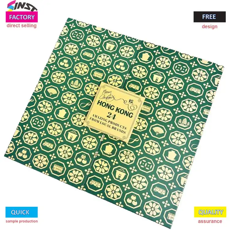 Tá Bosca Bronntanais Féilire Aidbhint na Nollag seo déanta as cairtchlár tiubh le patrúin clóite scragall óir ar an dromchla, rud a thugann mothú uigeachta dó nuair a chuirtear i dteagmháil léi. Tá spéirlíne na cathrach clóite ar chúlra dorcha glas, a bhreathnaíonn go leor galánta. Taobh istigh, tá 24 tarraiceán beag agus 1 urrann mór lár, atá díreach go leor chun iontas a choinneáil ar feadh 24 lá.