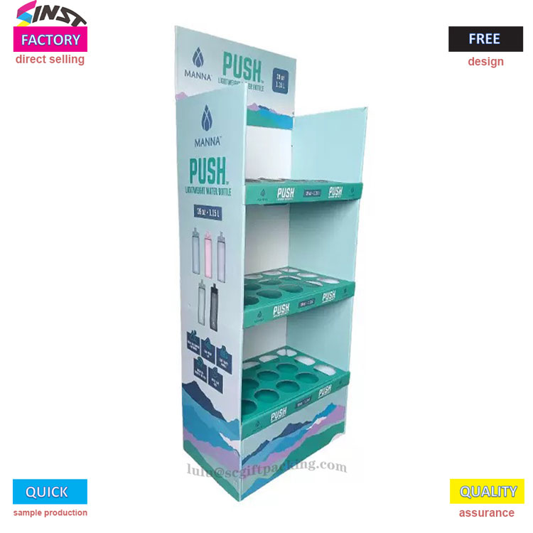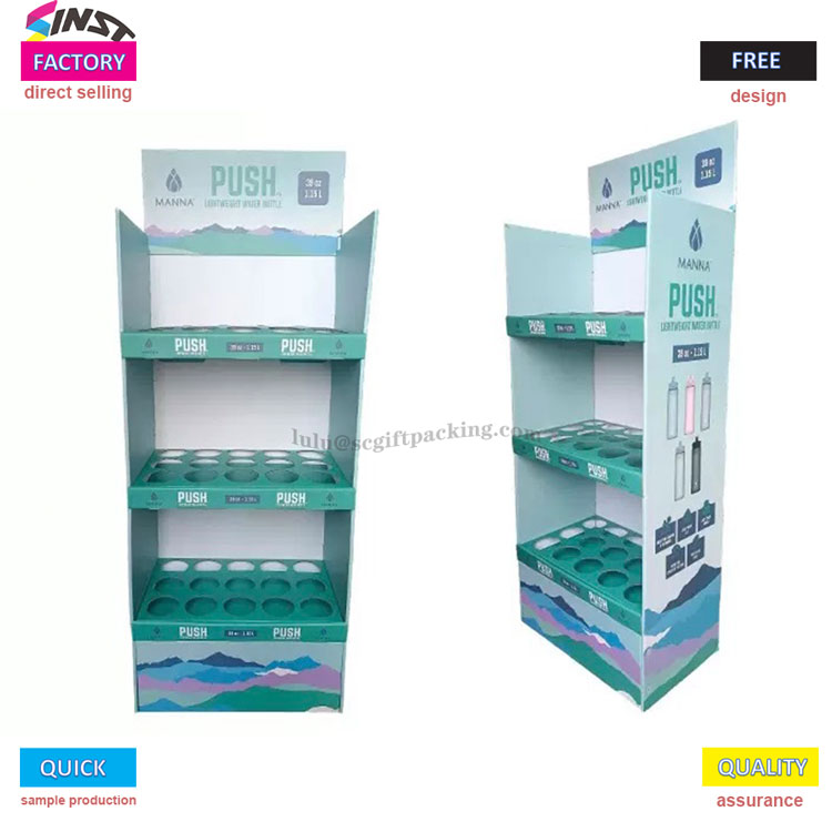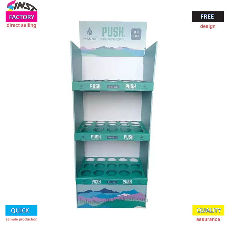 Tá dearadh struchtúr eangaí trí chiseal i gceist leis an seastán taispeána cartáin cairtchláir seo le haghaidh buidéal uisce Supermarke, le grooves ciorclacha ar gach ciseal chun an buidéal uisce a choinneáil go beacht agus chun rolladh a chosc. Is féidir lógó branda a phriontáil ar an mbarr, agus is féidir grafaicí táirge a phriontáil ar an taobh, simplí agus ardleibhéil. A úsáidtear den chuid is mó chun táirgí a thaispeáint mar bhuidéil uisce, cupáin, cupáin tae bainne, cupáin Thermos, etc.