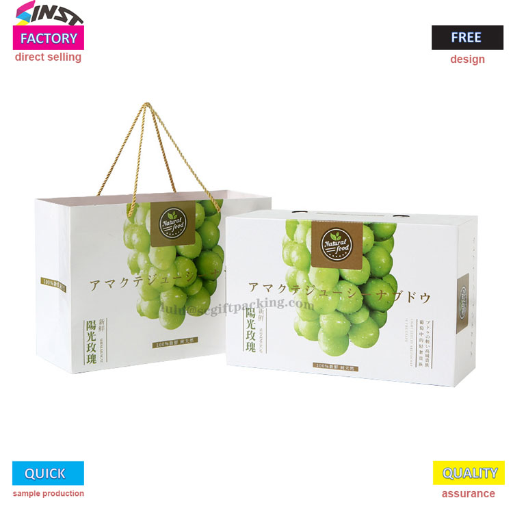 Déantar an bosca bronntanais láimhe uilíoch torthaí le haghaidh fíonchaora as ábhar cairtchláir r-chomhréalaithe treisithe, le patrún geal fíonchaor clóite ar an dromchla. Tá sé péireáilte le strap iompair glas ar an mbarr agus an lógó branda atá clóite ar an gcomhlacht bosca, ag cur ár bpríomh -fhealsúnacht seirbhíse in iúl go soiléir - níl aon ghá le hidirghabhálaithe difríochtaí praghais a dhéanamh, agus déanann an mhonarcha an próiseas iomlán ó roghnú go mais -tháirgeadh a bhainistiú.