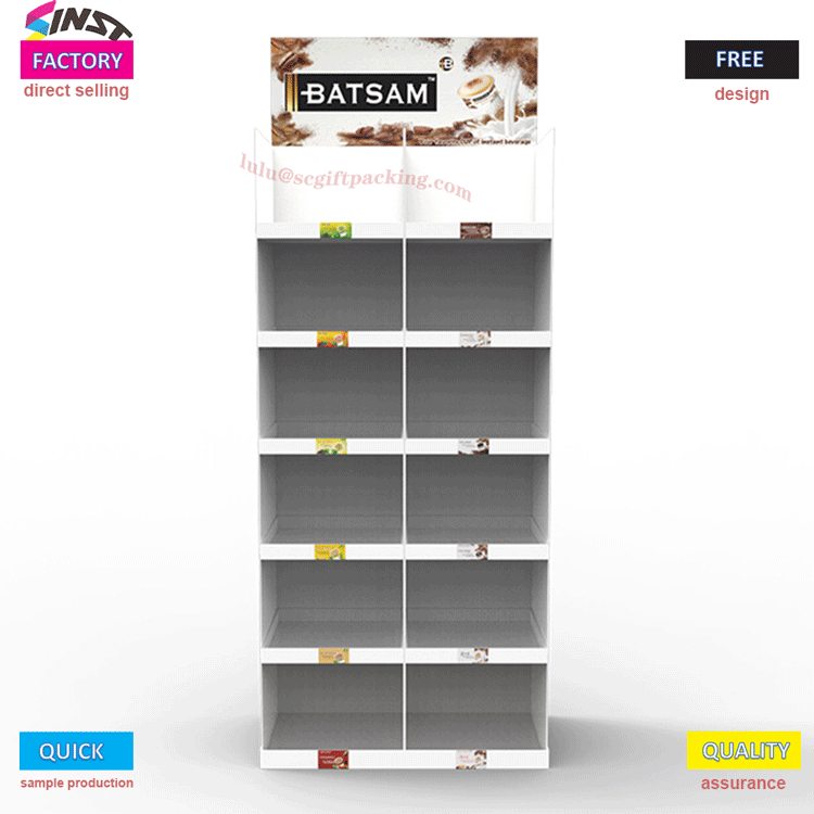 Is féidir le dearadh raca taispeántais cairtchláir cupán caife an Ollmhargadh cosc a chur ar chaife a bheith brúite nó damáiste, a cháilíocht agus a éifeachtúlacht mhaith a chothabháil. Struchtúr dlúth nach dtógann an iomarca spáis, a choimeádann do limistéar caife glan agus eagraithe. Ar ndóigh, braitheann na táirgí sonracha is féidir a luchtú freisin ar mhéid agus ar dhearadh an seastáin taispeána. Trí mheaitseáil i gceart, is féidir le racaí taispeána táirgí a bhaineann le caife a thaispeáint níos fearr, aird na gcustaiméirí a mhealladh, agus díolacháin a chur chun cinn.