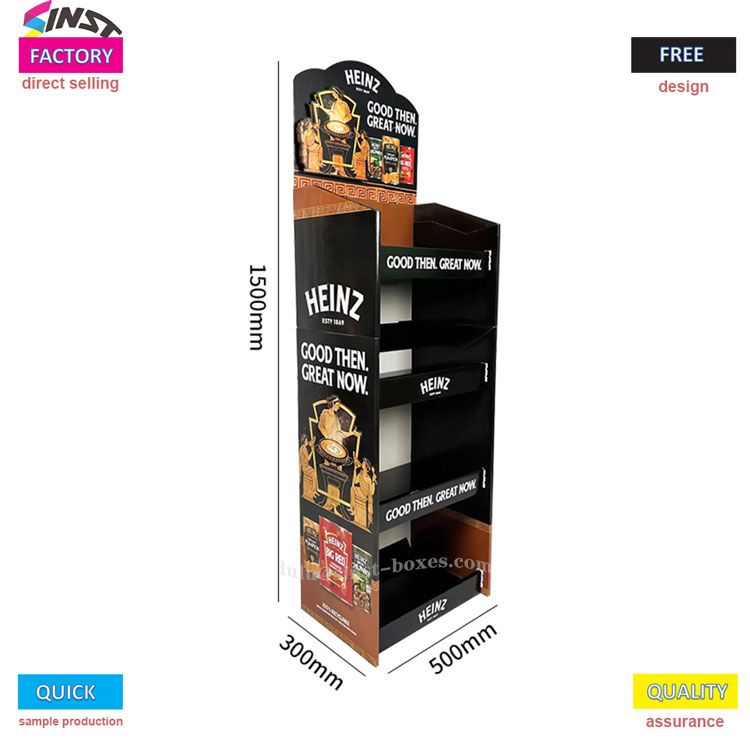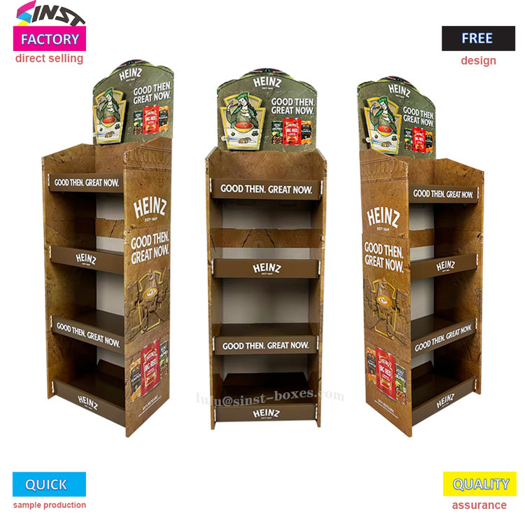 Breathnaíonn an seilf seo simplí, ach tá an dearadh cliste. Clóitear lógó an bhranda agus na focail "trátaí úrbhrúite" ar an taobh tosaigh agus ar an taobh araon, agus cuirtear an buidéal anlann trátaí. Macallaí an dearadh ar chorp an bhuidéil agus ar an seilf, amhail is dá mba rud é go bhfógrófaí an táirge. Tá na seilfeanna claonta, mar sin ní sleamhnóidh na buidéil síos agus is furasta iad a ghlacadh. Tá sé i bhfad níos néata é a úsáid chun pacáistiú bia a thaispeáint in ollmhargaí ná é a chruachadh ar an talamh. Is féidir le custaiméirí gach cineál anlainn a fheiceáil go héasca, agus tugtar blastanas eile faoi deara freisin.