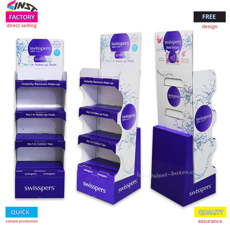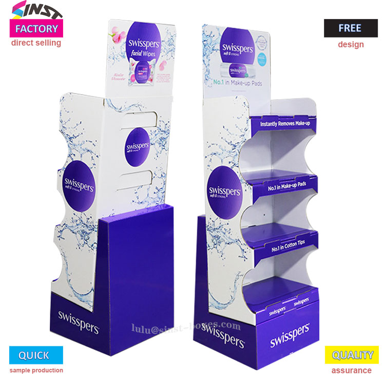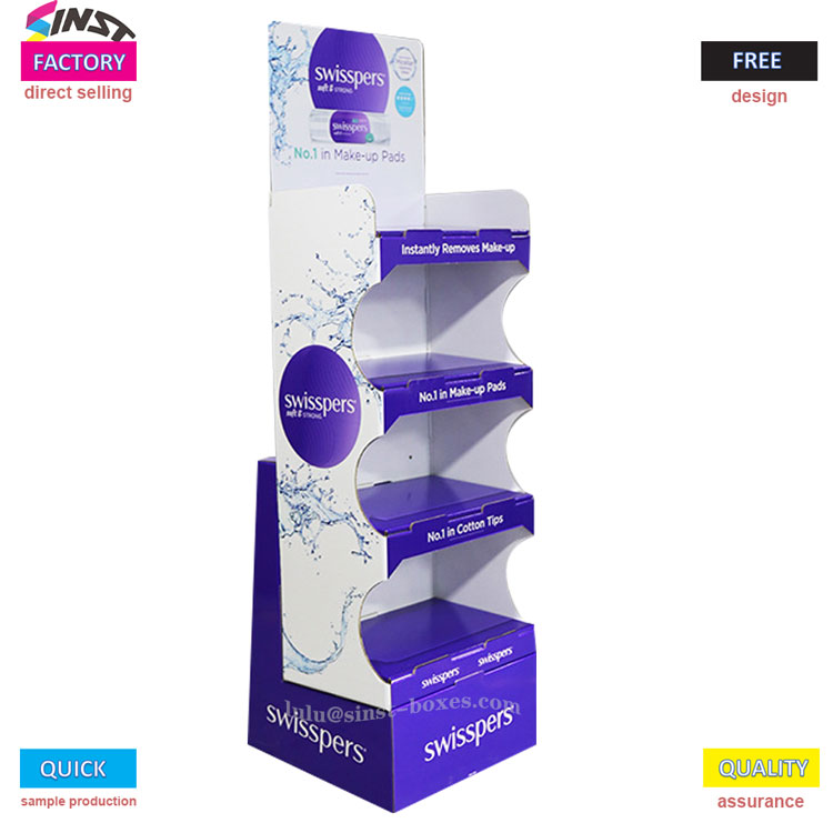 Tá patrún spraeála uisce mór clóite ar an tosaigh ar ár raca taispeána wipe fliuch, chomh maith le limistéar ubhchruthach corcra. Tá na sraitheanna íochtair de dheighiltí lipéadaithe le clibeanna corcra a léann "Bost Tapa Makeup", "Díolacháin Cotton Barr Makeup", agus "Díolacháin Swab Cotton Barr". Tá na lipéid ag bun beag i méid, ach is buntáistí táirge iad go léir.